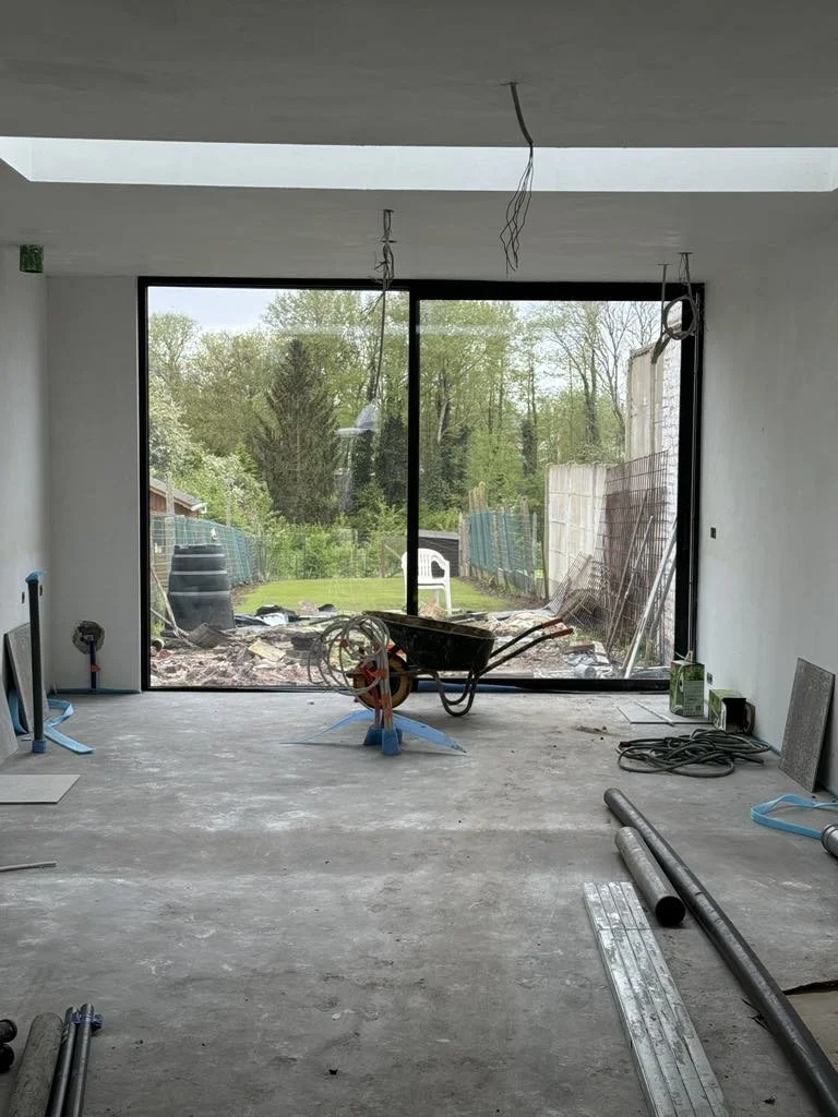 ✔️ Nieuwbouw van een aanbouw, naadloos geïntegreerd in het bestaande volume. De dragende poutrel werd zorgvuldig ingewerkt in de betonvloer om een strakke, esthetische overgang te creëren